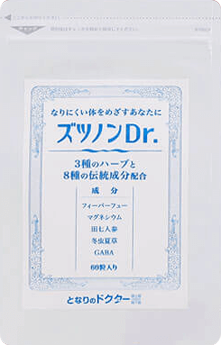 天気や体調で急に来るガンガンとした痛みに悩んでいました。ズツノンDr.は同僚が飲んでいて効果があったと聞いたので一緒に飲み始めました。小さな錠剤を2錠飲むだけなので飲み忘れなければ特に問題もなく飲み続けられます。飲み始めて1か月たっても飲んでる意味があるのかないのか、効果を実感できなかったので飲むのをやめてしまいました。